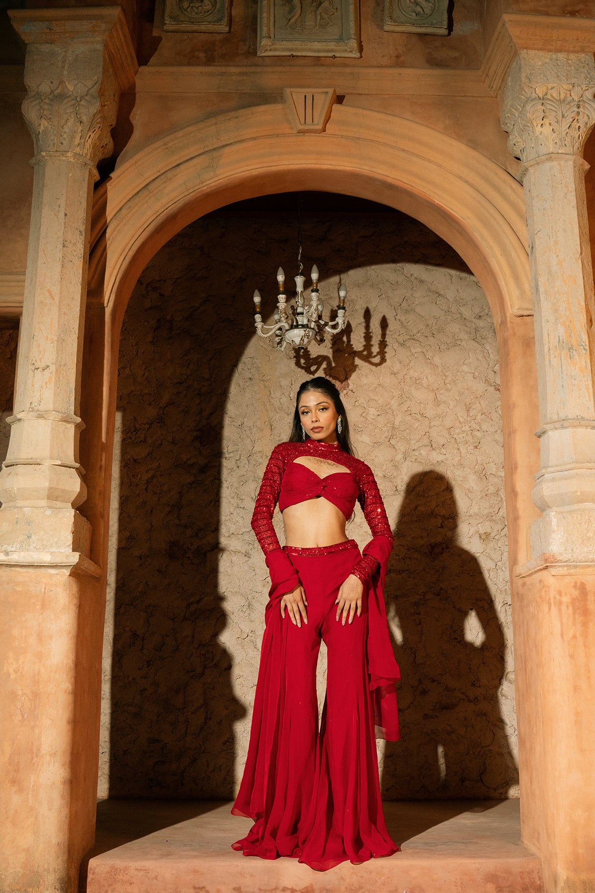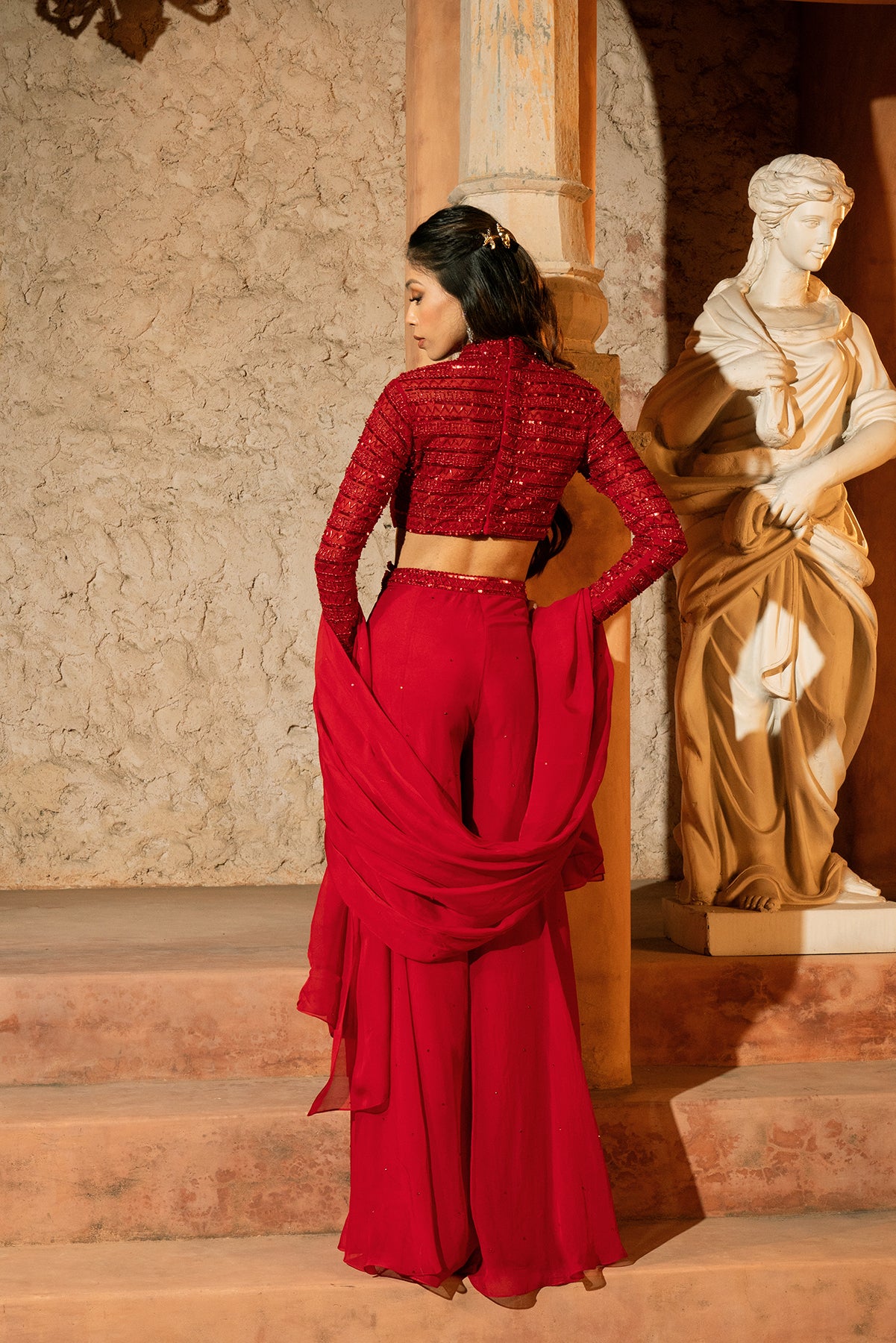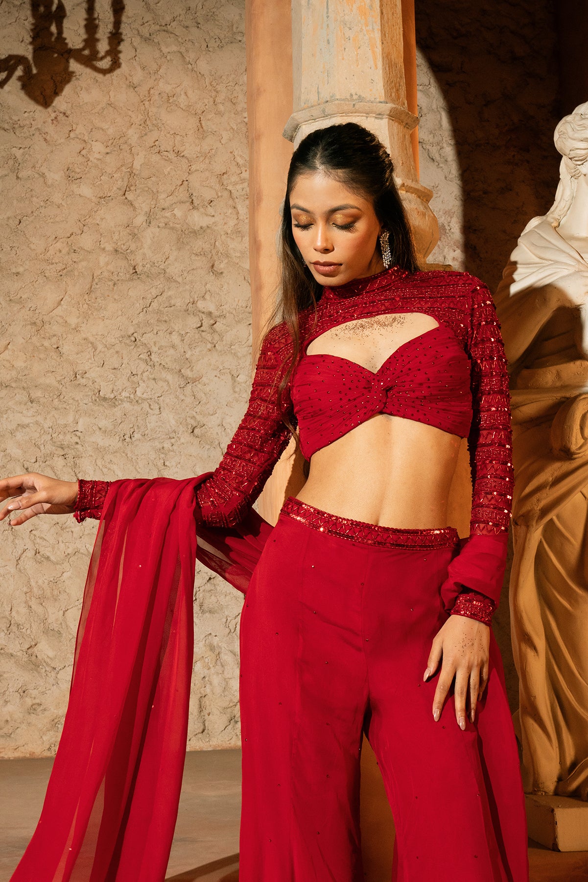 ELENI PANT SET- Ruchhed embroidered blouse with flared pant and stole