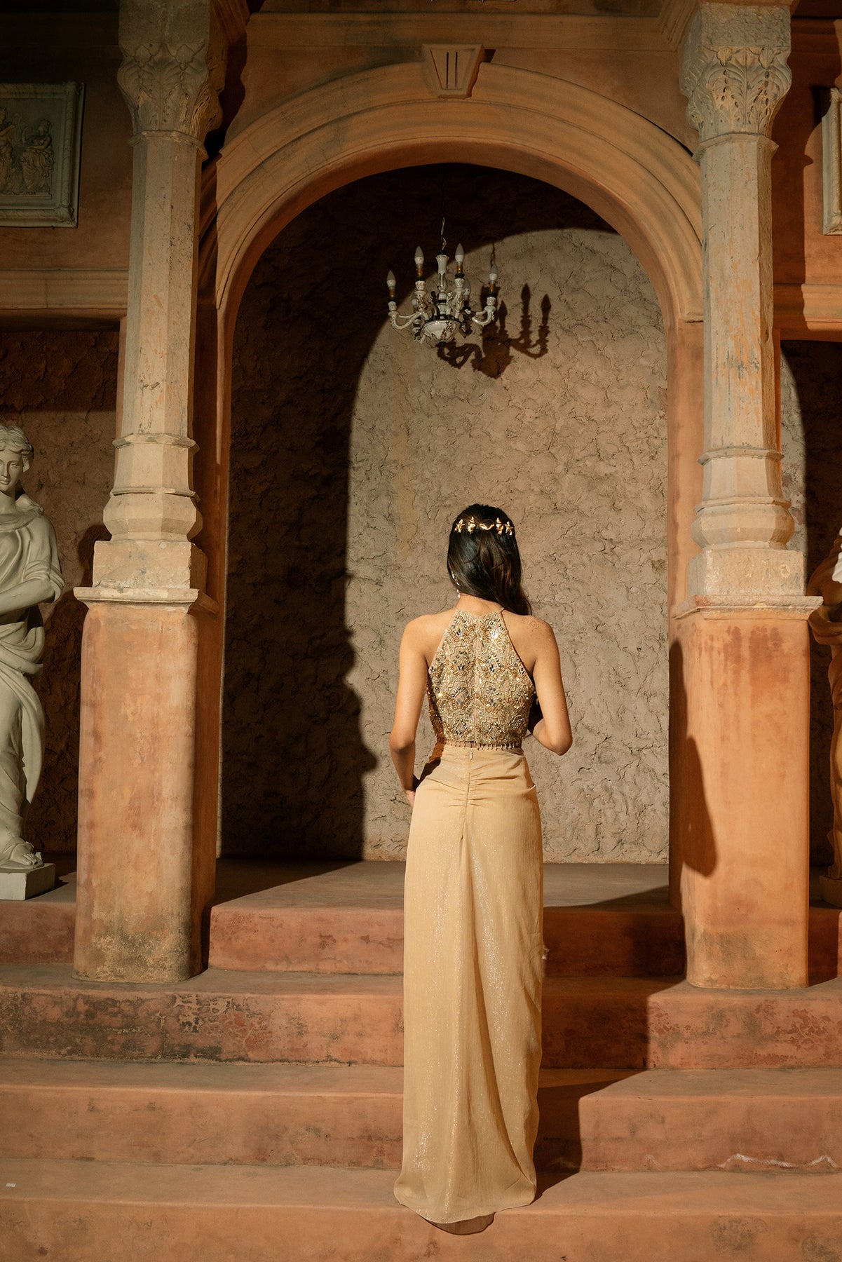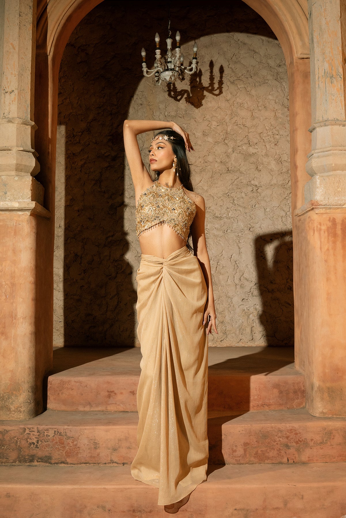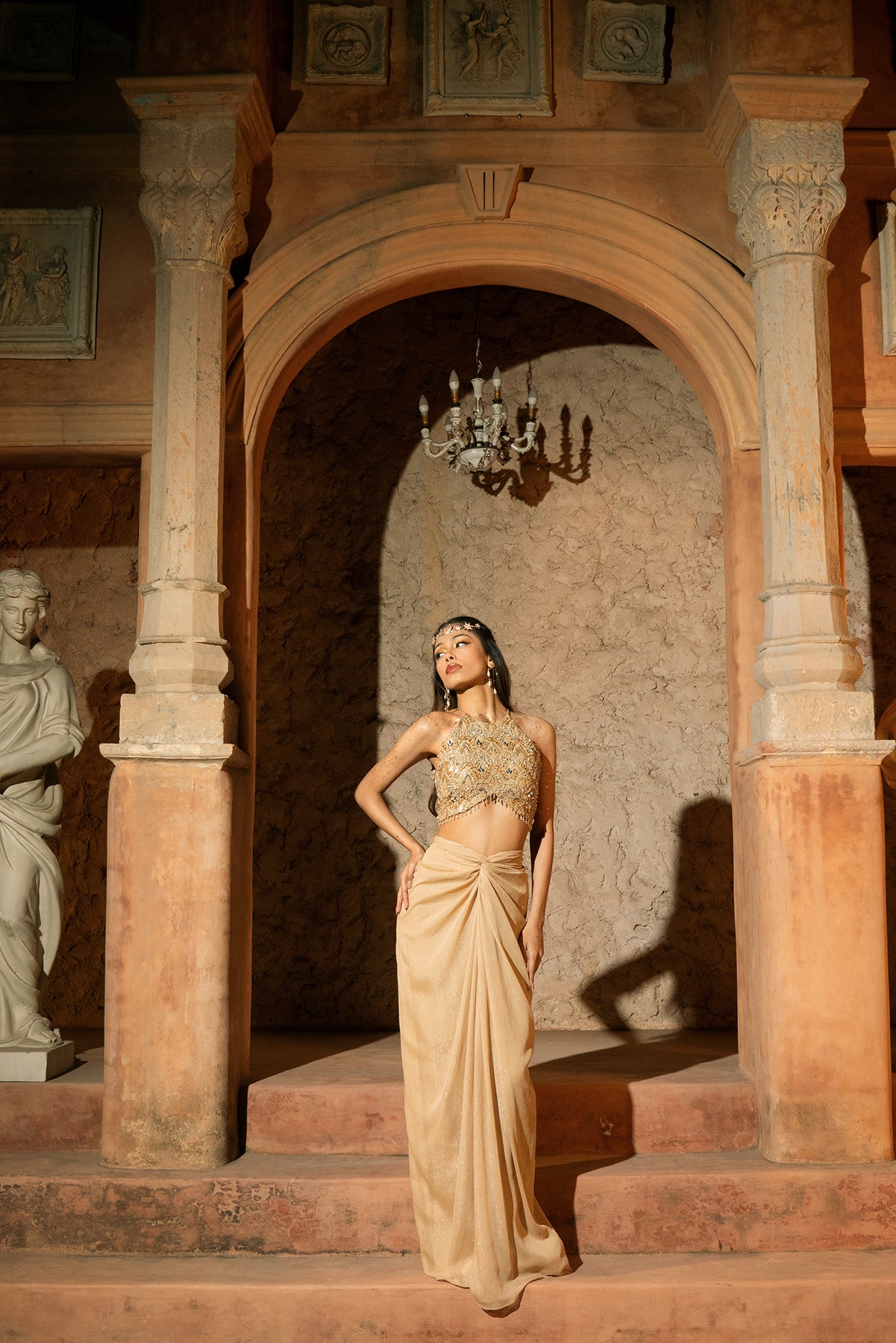 KLEIO SKIRT SET- Knotted draped skirt and embroidered v-hem blouse
