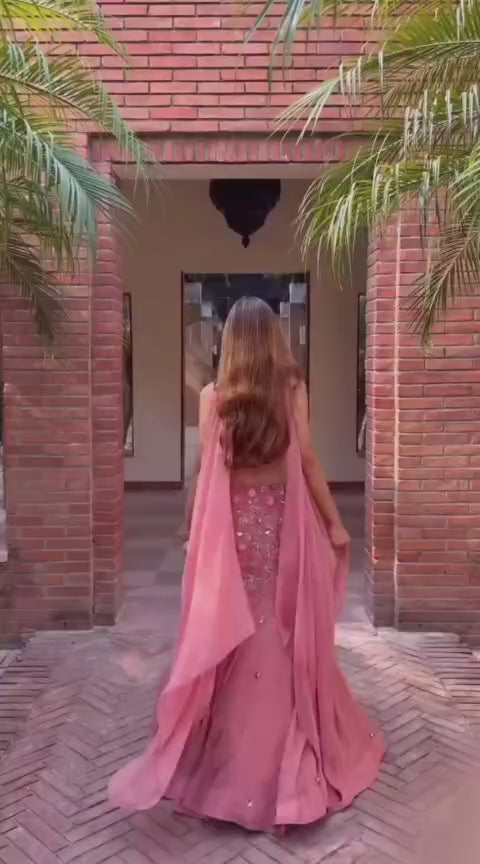 FLORAL EMBROIDERED LEHENGA WITH A CRYSTAL-STUDDED BUSTIER AND ORGANZA DRAPE, PERFECT FOR WEDDING CELEBRATIONS.